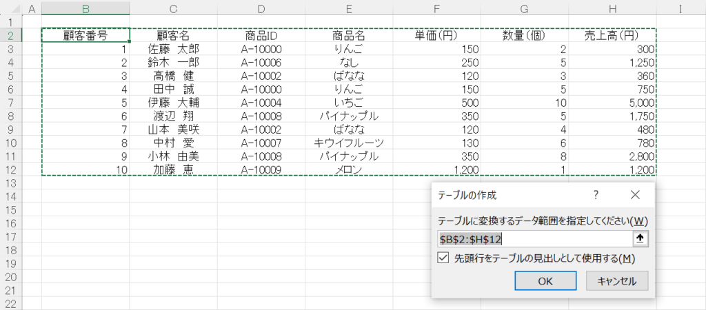 ③[テーブルの作成]ダイアログボックスが表示されます。