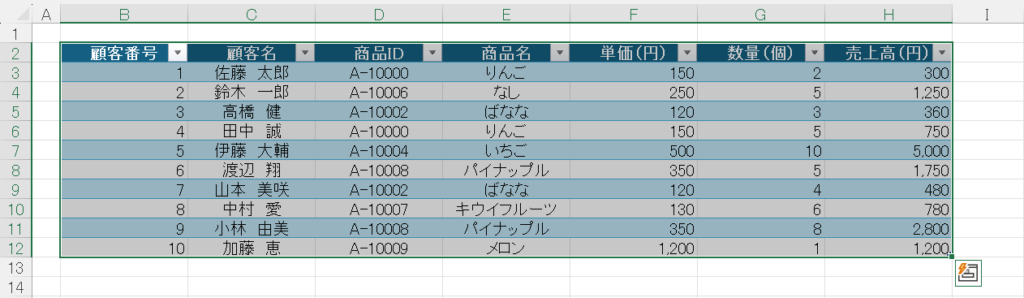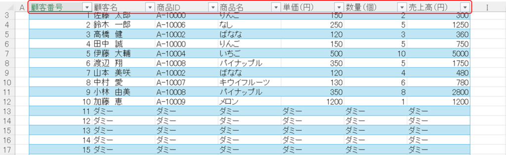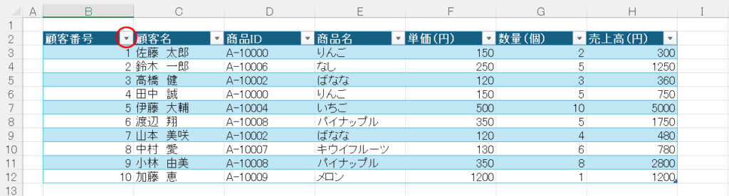 テーブル機能を活用するとフィルターの▼アイコンが自動的に表示されます。