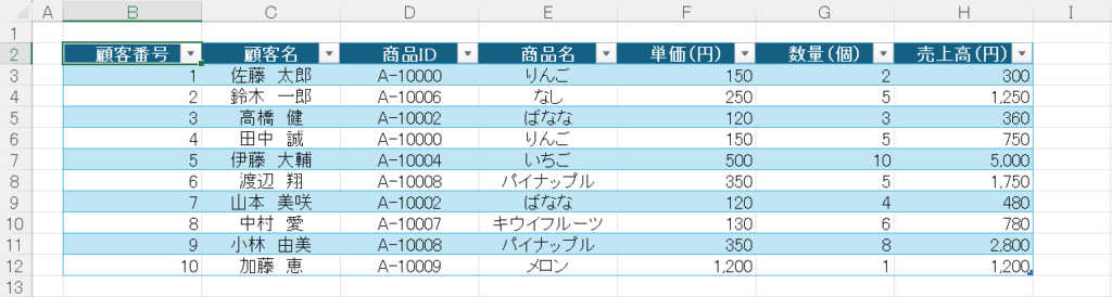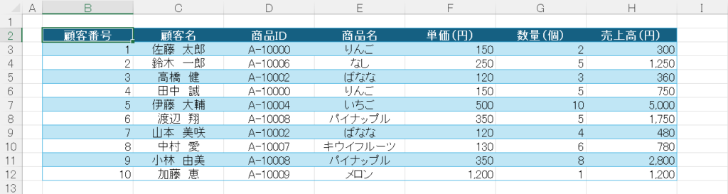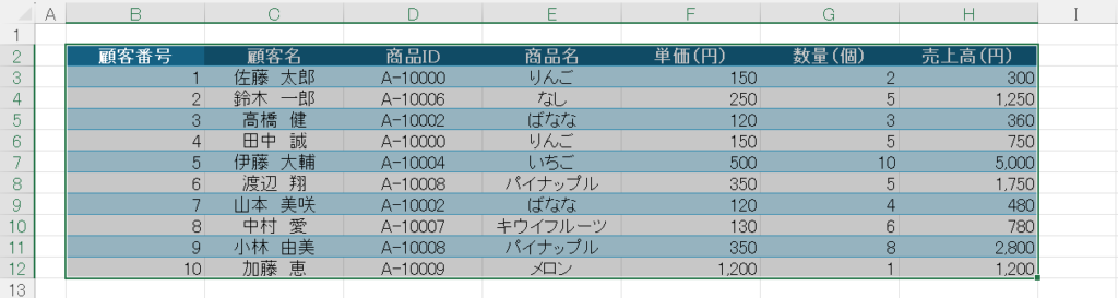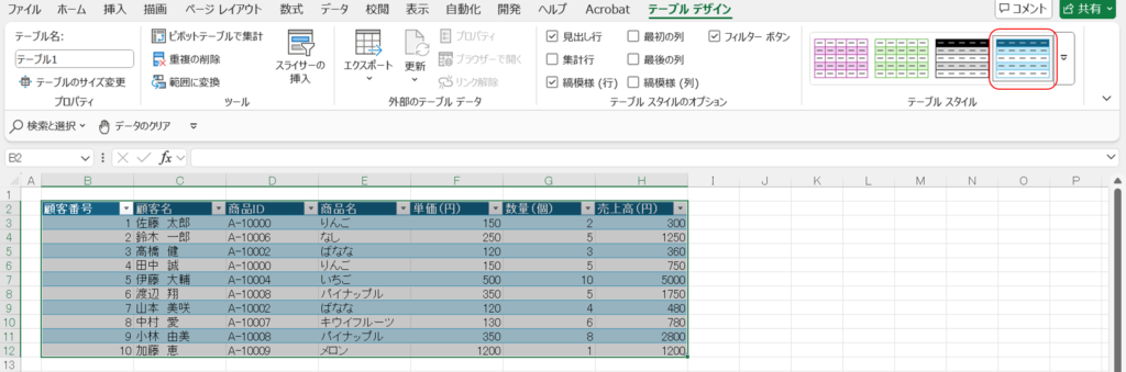 テーブル機能を活用するとテーブルスタイルが適用され、見た目が縞模様となり、表が見やすくなります。