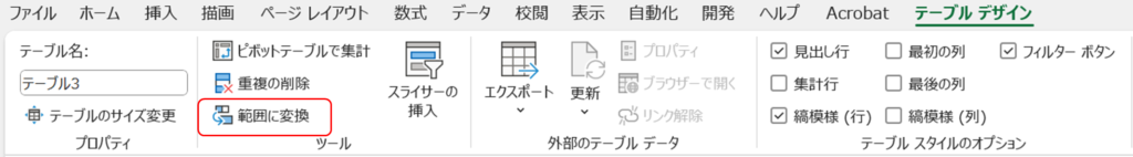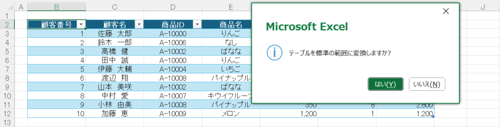 ③「テーブルを標準の範囲に変換しますか?」とのメッセージが表示され、「はい」をクリックします。