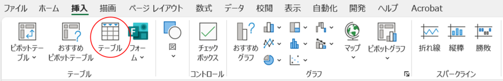 ②「Ctrl+T」又は挿入タブの「テーブル」をクリックします。