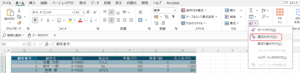 ②[ホーム]タブのクリア(書式のクリア)をクリックします。