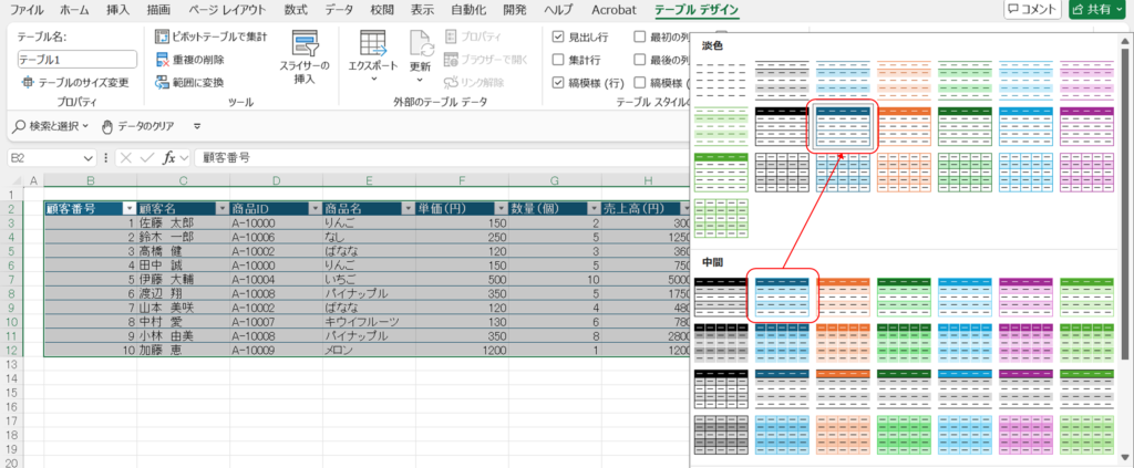 [テーブルデザイン]タブのテーブルスタイルを変更すれば、簡単にデザインを変更することができます。