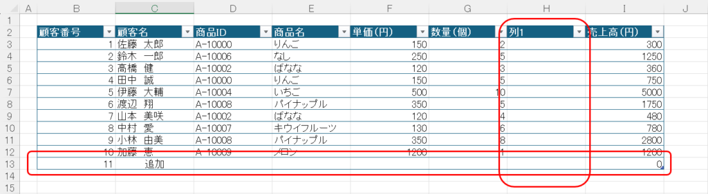 新たに行・列を追加した場合、デザインスタイルと同様に数式やセル範囲が自動反映されるので、個別で整える必要がありません。