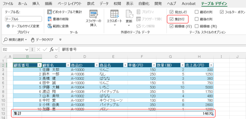 [テーブルデザイン]タブのテーブルスタイルのオプションで、集計行に☑を入れると自動で集計行が追加されます。