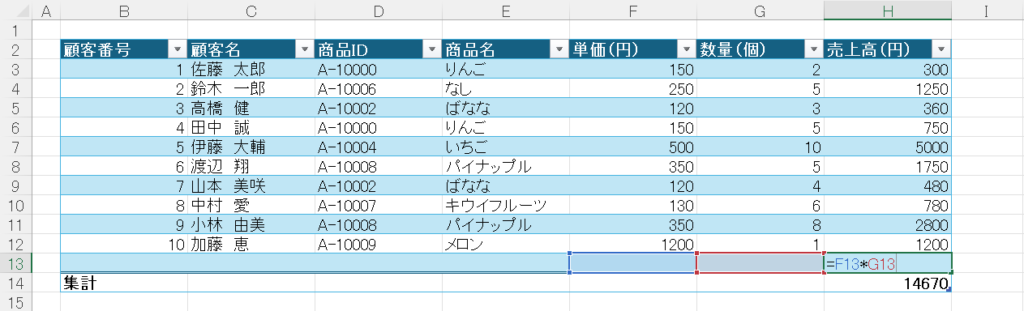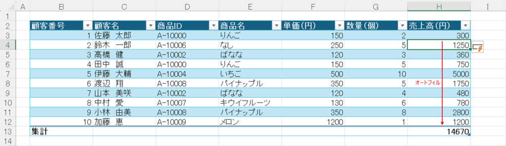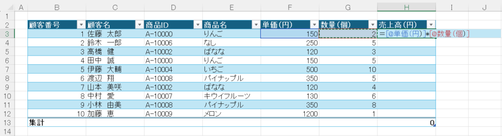 ちなみに、テーブル化の表に数式を入力すると、他のセルにも自動で数式が入力されるので、コピペ等の処理が不要となります。