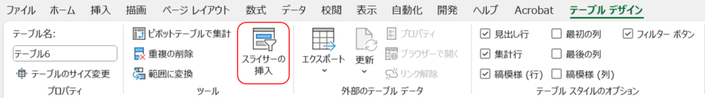 [テーブルデザイン]タブのスライサーの挿入をクリックすることで、データをボタン操作で直感的に絞り込むことができます。