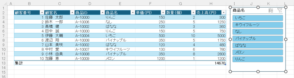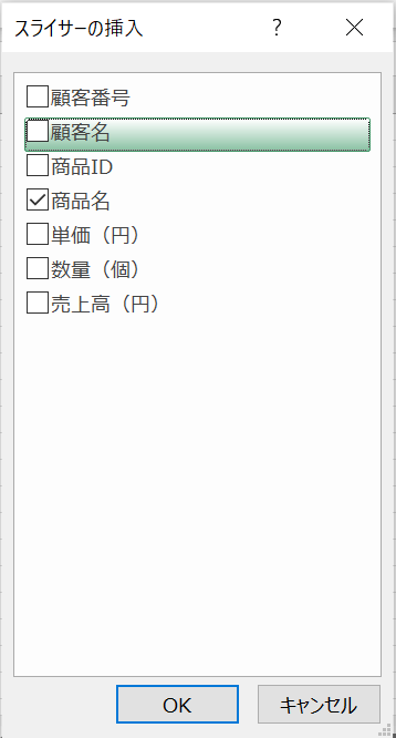 今回は「商品名」を選択し、「OK」をクリックしたところ、「商品名」のスライサーが表示されました。