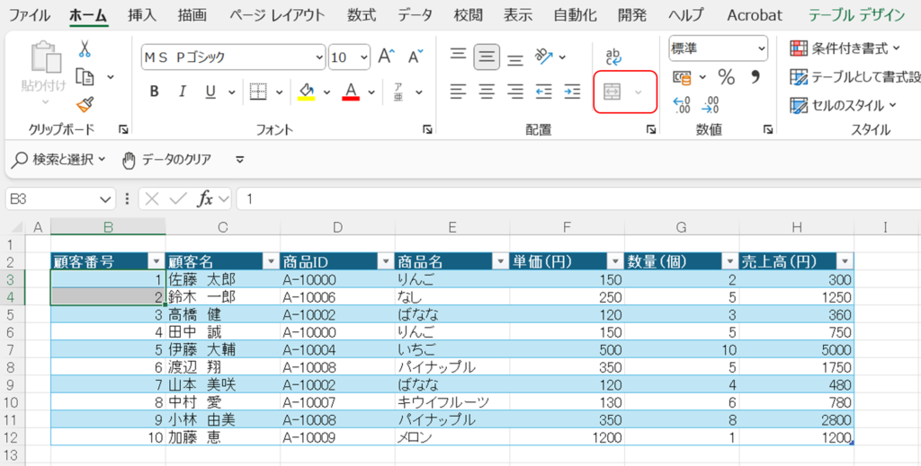 ①表内のセルを選択します(表内のセルであればどこでもOK)。